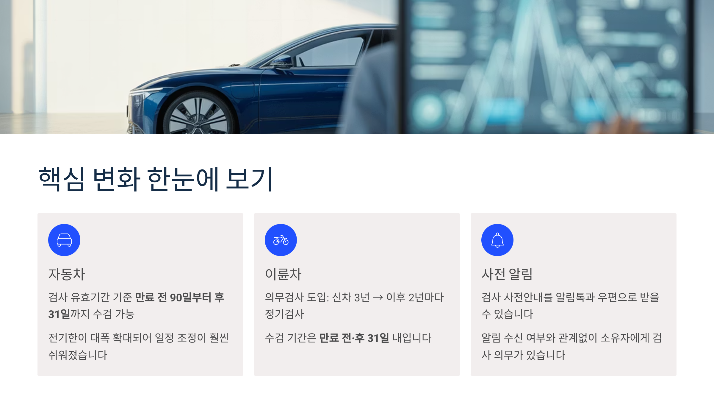 - 이륜차: 의무검사 도입. 신차 3년 → 이후 2년마다 정기검사. 수검 창구는 만료 전·후 31일.