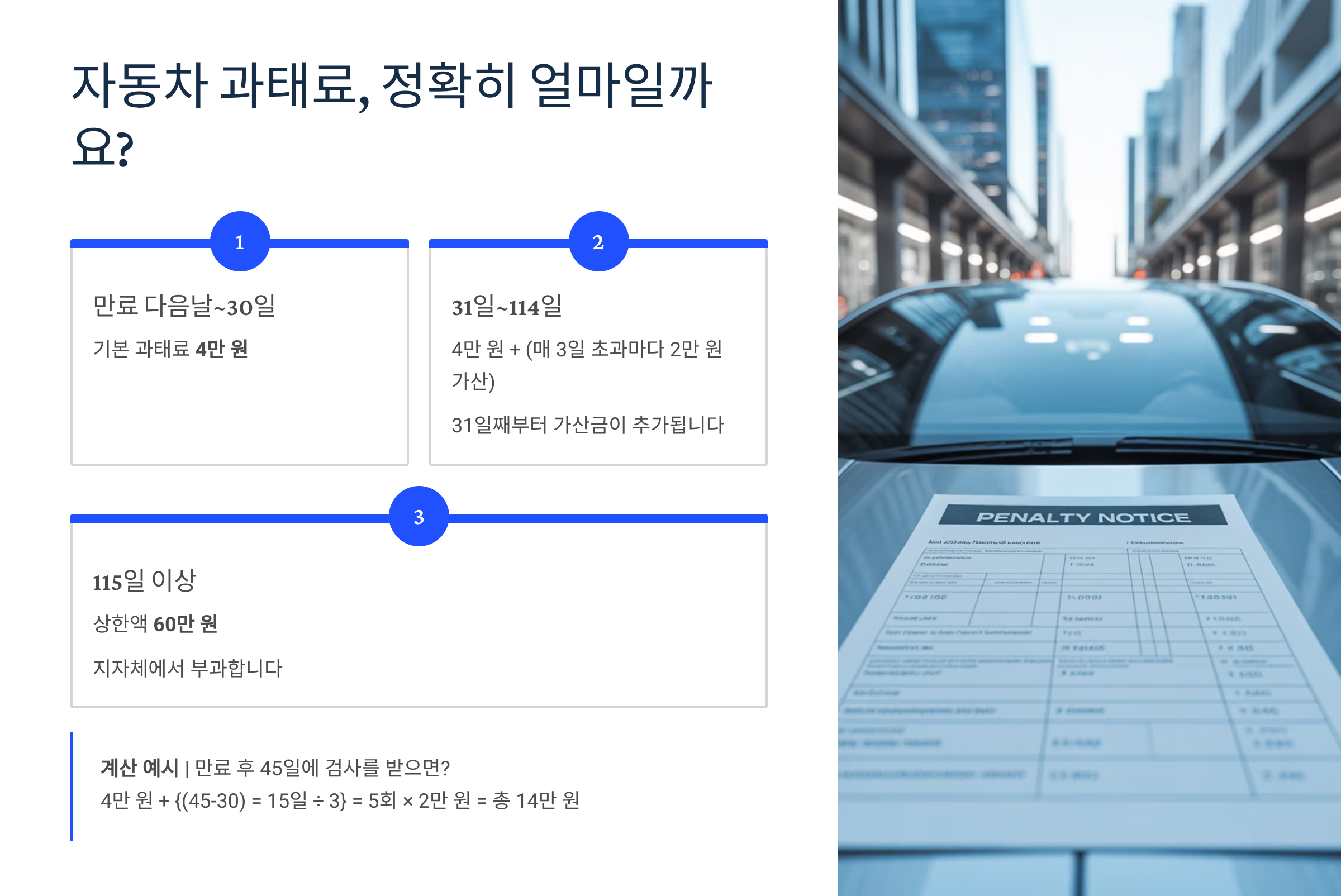 예시|만료 후 45일에 검사 → 4만 + {(45−30)=15일 ÷ 3}=5회×2만 = 총 14만 원.